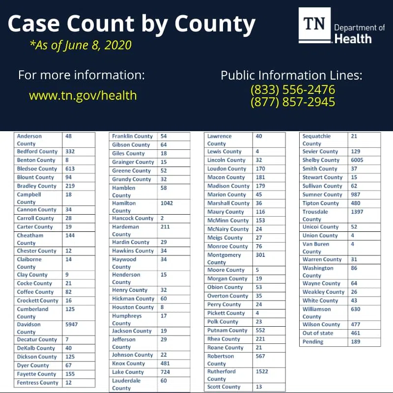 Tennessee’s new statewide COVID-19 numbers show an increase of 563 in the number of cases, that pushes the total to 26,944. There have been 17,563 recoveries and 421 deaths with 1,948 hospitalized associated with COVID-19.