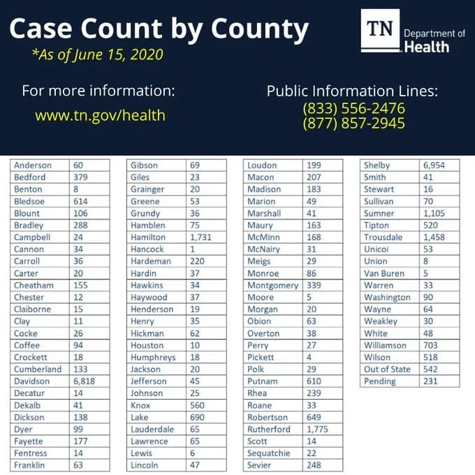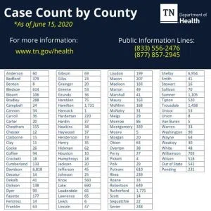 Tennessee’s new statewide Covid-19 numbers show an increase of 728 in the number of cases, that pushes the total to 31,160. There have been 20,062 recoveries and 483 deaths (+8), 2,106 hospitalized, associated with Covid-19.