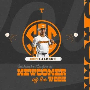 UT players have been named the SEC Newcomer of the Week in each of the last three weeks with Gilbert earning the award twice and Jordan Beck also garnering the honor after his big series against Kentucky two weeks ago. In total, the Vols have had five players earn SEC weekly honors this season (Gilbert, Beck, Jake Rucker, Sean Hunley, Blade Tidwell).