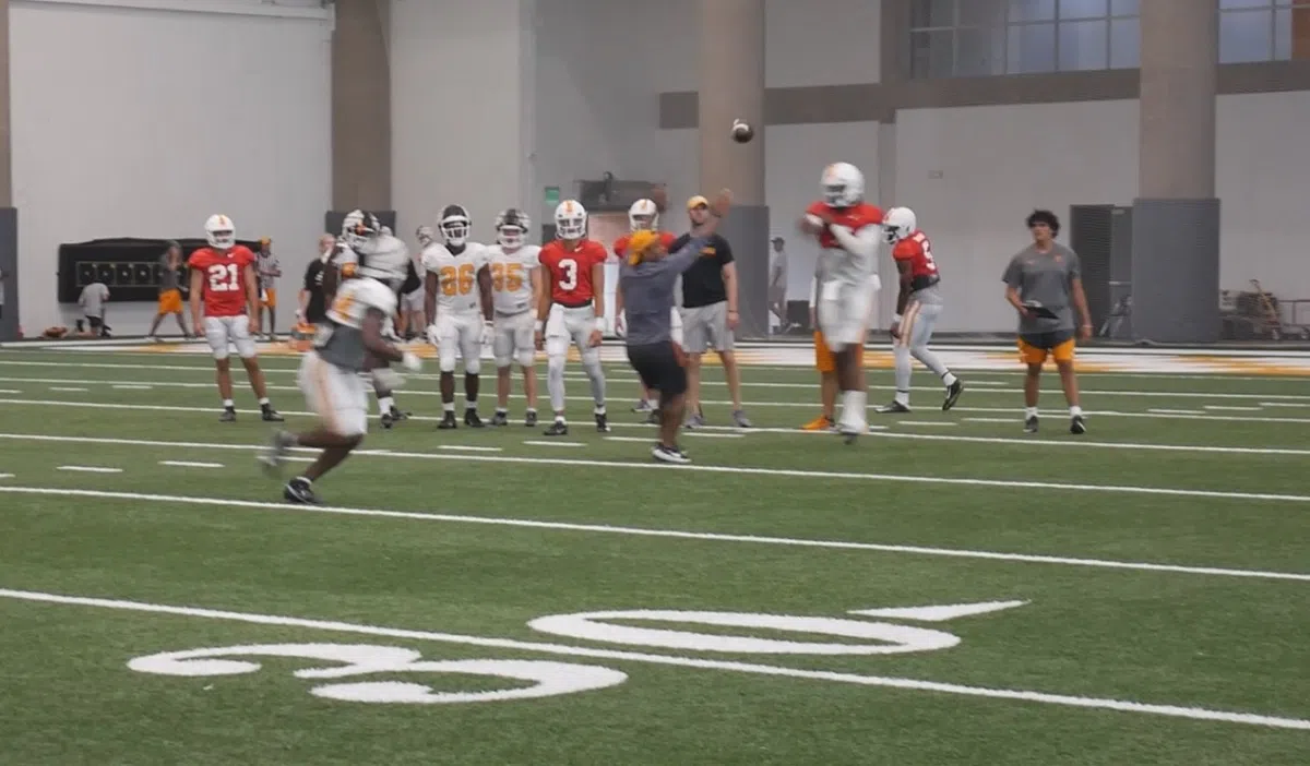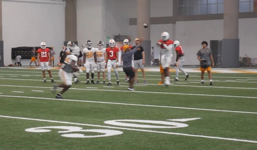 The Tennessee Volunteers were practicing in full pads on Sunday in preseason practice 6 at UT ramping up for their first fall scrimmage on Tuesday. Vols QB Joe MIlton & RB Dylan Sampson / Credit: 99.1 The Sports Animal