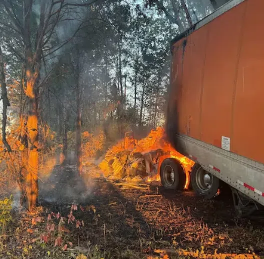 It happened around 6:30 p.m. in the woods off eastbound I-40 between N. Campbell Station Road and Lovell Road when the truck driver lost control, drove off the interstate and deep into the woods behind the Turkey Creek mall area before the truck caught fire.