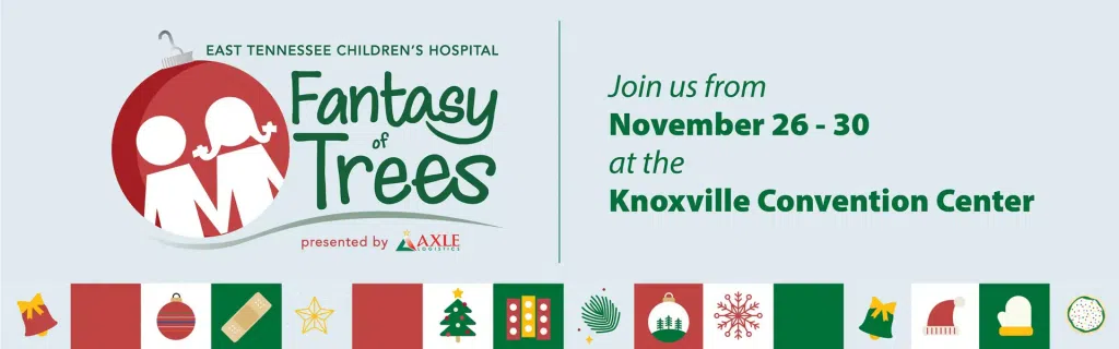 East Tennessee Children’s Hospital Fantasy of Trees presented by Axle Logistics is returning in 2025, and will be the holiday event you don’t want to miss. This holiday tradition is the hospital’s largest fundraiser, attracting nearly 60,000 people during the week of Thanksgiving. Travel through a forest of more than 350 beautifully designed trees, holiday accessories, mantels, door designs, table centerpieces and an Adopt-a-Tree forest decorated by local school children. All priced to sell.