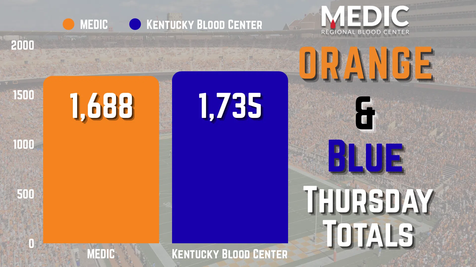 Knoxville, TN (WOKI) – The annual Orange versus Blue Blood Drive Competition between MEDIC Regional Blood Center and Kentucky Blood Center enters the final day tomorrow (Friday) to see who can collect the most blood products.
