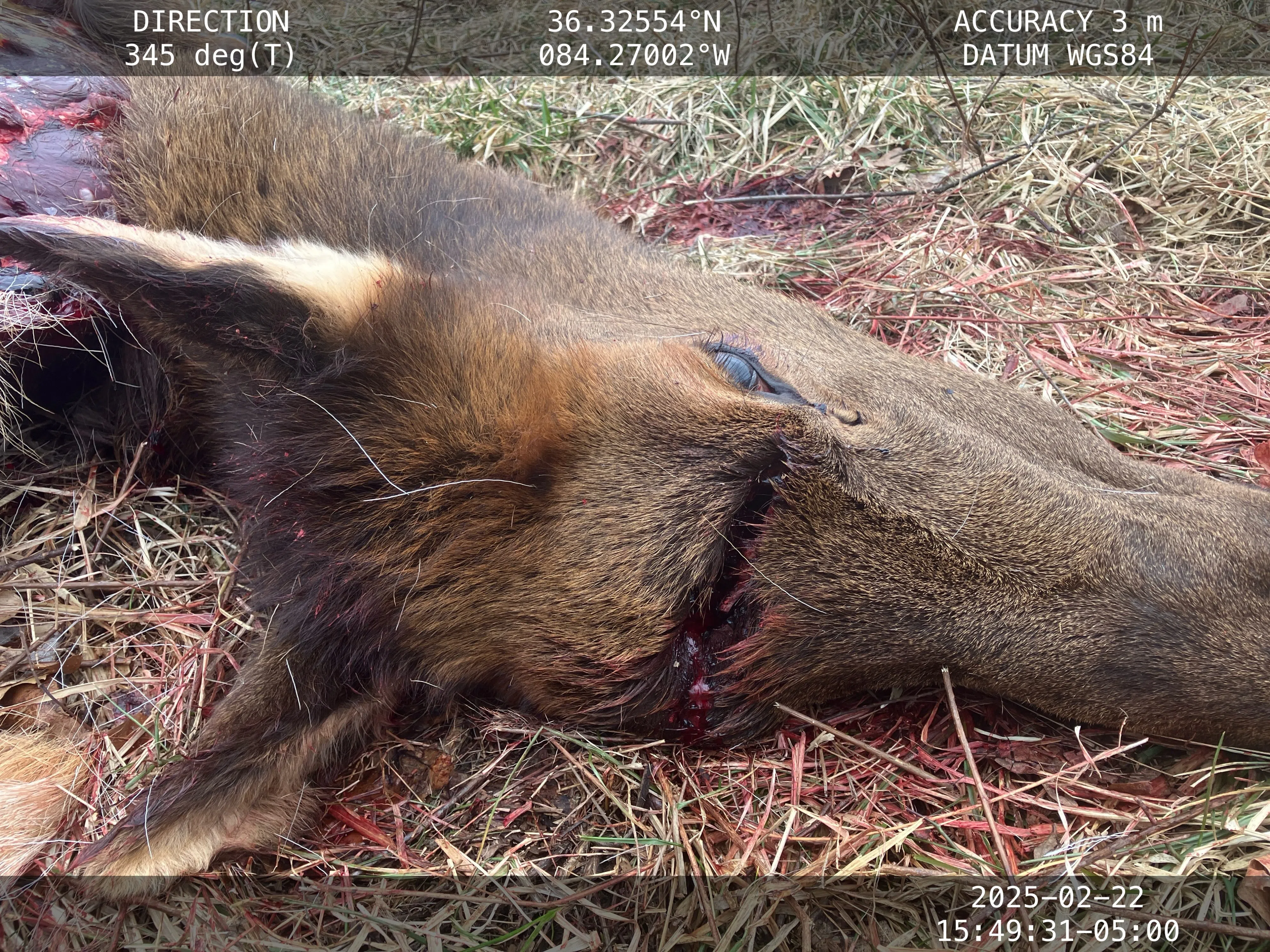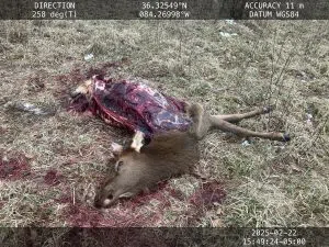 On the afternoon of Saturday, Feb. 22, 2025, a report was received regarding an elk carcass found on the Royal Blue Unit of NCWMA. Wildlife Manager Darrell England was first to arrive on the scene and located the remains of an elk that appeared to have been shot within the previous few days. Wildlife Officer Spencer Wilson and Wildlife Manager Brenden Marlow responded and assisted in collecting evidence. Officers reported that multiple parts of the elk had been removed, and several pieces of evidence were recovered from the scene.