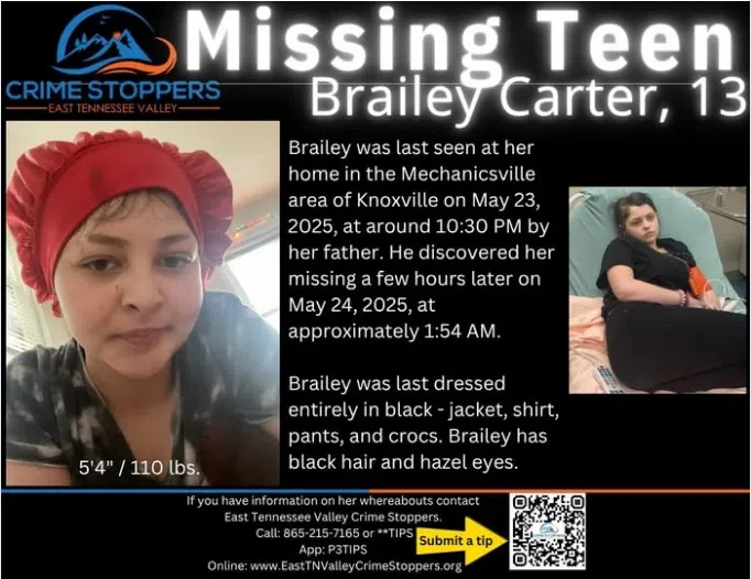 Knoxville, TN (WOKI) Knoxville police are asking for help finding a missing teenage girl.KPD says 13-year-old Brailey Carter was last seen by her father at her home in the Mechanicsville area of Knoxv...