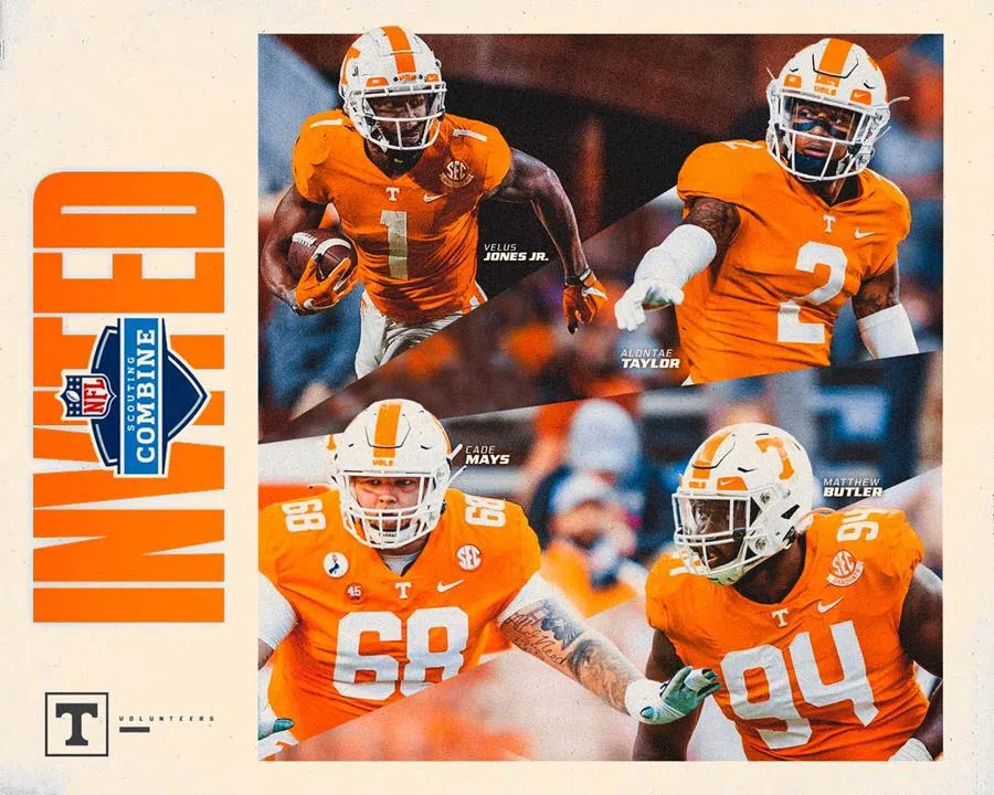 INDIANAPOLIS - Tennessee VFLs defensive tackle Matthew Butler, wide receiver Velus Jones Jr., offensive lineman Cade Mays and defensive back Alontae Taylor will show...